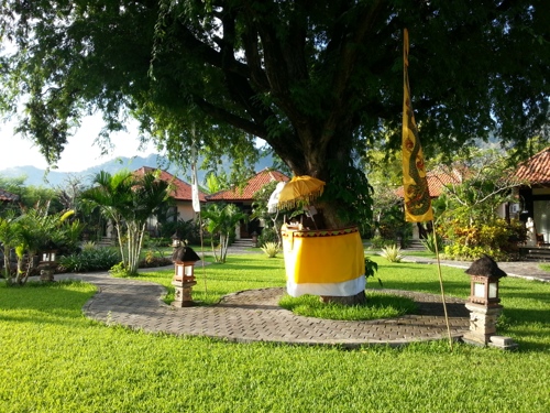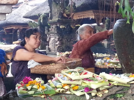 Sin lugar a dudas una isla con una micro-cultura basada en el respeto, en la fé, en el trabajo del karma y las próximas vidas. Hinduístas con su toque animista (creencia en los espíritus del más allá), los balineses están siempre agradeciendo y realizando ofrendas de flores y comida a todo (los Dioses, el coche, las casas, el trabajo, la tierra, etc etc etc). Por las mañanas, generalmente las mujeres salen con grandes bandejas llenas de ofrendas preparadas en pequeñas bandejitas de hojas y flores, casi siempre algo de arroz e incienso, que reparten por todo cuanto lado, algo que por veces se torna complicado hasta esquivar (Raúl varias veces se llevó por delante ofrendas, flores e inciensos!!!). Tienen en todas las casas nichos de material con pequeños altares donde veneran a sus Dioses y colocan sus ofrendas. No es poco común ver a dichos altares, imágenes y estatuas, o incluso árboles, estar cubiertos por una tela a cuadros blancos y negros, señal de sagrado.