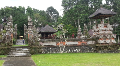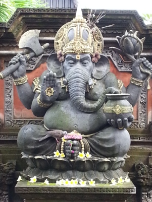 Llegamos a la isla de Bali procedentes de Surabaya (Java). Aeropuerto enjardinado, como otros de Indonesia. Negociamos el taxi que nos llevará al pueblo de Ubud en el centro de la isla. El viaje tomará más de una hora, atravesando algunas ciudades y pequeños pueblos. Desde la salida del aeropuerto, un aspecto prolijo como no habíamos visto en otros lados del país. Veredas arregladas, carpinterías llenas de muebles tallados, locales con cientos de esculturas representando dioses, remates de techos, adornos, fuentes. Empezamos a señalarnos a derecha e izquierda, casas suntuosas con sus hermosos techos piramidales rectangulares rematados con esculturas en los ángulos; templos con entradas talladas, puertas esculpidas doradas y rojas, riquísimos cielorrasos rayonados con bambú, espíritus tallados en madera y pintados en colores. Mercados coloridos, templos familiares más o menos ricos pero todos ocupando lugares de privilegio. En todo el trayecto y cada vez más frecuente, galerías de arte, tiendas de artesanía, de ropa. Todo con un sentido estético que nos va encantando: plantas, flores por doquier adornan el paisaje. Esta es la Indonesia que teníamos en nuestro imaginario.