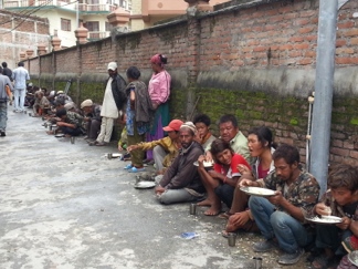 Dentro de mis experiencias con los tibetanos que fui conociendo, y con quienes me sentí muy identificado seguramente por la experiencia directa vivida en el Tibet, fue conocer a Sangji, otro exiliado que hoy vive en Nepal y se dedica, entre otras cosas, a vender alfombras. El y un grupo de amigos y monjes, hace ya unos años que formaron una organización, bien elemental, pero con un fin muy noble dentro de la colectividad principalmente tibetana en Nepal. Tres veces por mes cocinan para alimentar a indigentes y principalmente lisiados que viven en las calles de la ciudad. Me llamó la atención cuando me comentó esta iniciativa, la que sin dudarlo acepté a compartirla al día siguiente de conocerlo. Al mediodía acompañé a estos 6 jóvenes a cocinar y repartir arroz, granos, vegetales, agua y escasas rupias a cada uno de las más de 100 personas que ese día hicieron fila por horas en la puerta del centro. Realmente interesante, además de por la viviencia intensa en sí, por la posibilidad de revivir de una forma u otra, el mismo objetivo que compartí hasta el año pasado con mi grupo de señoras en la iglesia en Sao Paulo. Sin duda, en este caso las condiciones de las personas en Nepal, los niños y los discapacitados, poco pueden compararse con los ¨sin techo¨ para quienes cocinamos en Brasil.