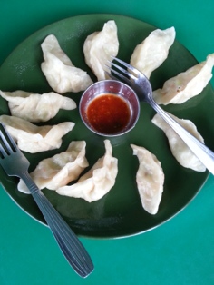 La comida nepalí está muy influenciada por las tradiciones indias. Aunque utilizan las mismas especies y principales ingredientes para su dieta, los platos típicos nepalíes son básicamente menos especiados y definitivamente bien más suaves en picante. El plato aparentemente más popular, aunque tan conocido en tantos otros países asiáticos, son los conocidos Momos o dumplings, que rellenan principalmente con vegetales, algunas veces con carne de búfalo (importado de India, como la gran mayoría de todo lo que se consume en el país), y se cocinan al vapor y acompañan con salsas picantes y sabrosas. Obviamente el arroz y los tubérculos son parte esencial de la dieta local, fundamental para trabajar el bolo con la mano derecha y unirlo al resto de los alimentos que comen con la mano.