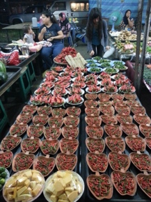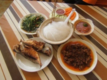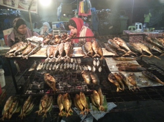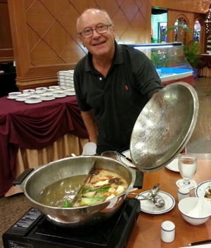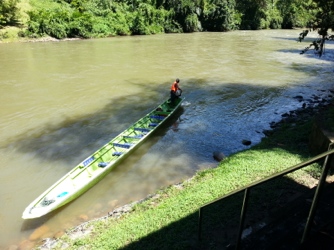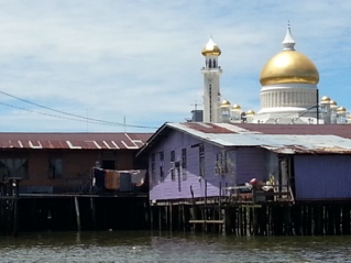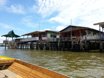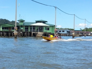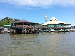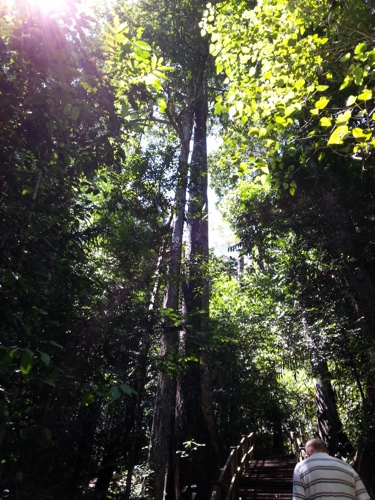 Son las ocho de la mañana y llegamos al muelle en el río Brunei en pleno centro de la ciudad. Hoy es feriado en Brunei. Compartimos la lancha cerrada con 15 personas más, casi todas forman parte de grupos familiares muy endomingados casi todos con tablets y cosas para comer durante el viaje que durará sólo 45 minutos por el río. Las riberas cubiertas de vegetación, cada vez con más palmeras hasta no ver otra cosa en la costa. LLegamos a un pequeño pueblo, Bagor, donde nos recibe un guía que nos lleva a una camioneta que nos conducirá a una villa ecológica en algo más de media hora; ya aprieta el sol y el calor, por suerte la camioneta tiene buen aire acondicionado. Llegamos a la villa, todos muy amables, turistas que se aprestan a regresar comentan que la experiencia fue muy buena, otros van a ir con nosotros; nos ofrecen café (agua con color) algo de comer, oh sorpresa, deliciosas bananas fritas que nos recordó los buñuelos de abuela. Invitan a Juan Martín para que haga el preparado del almuerzo: trozos de pollo, verduras frescas cortadas, especias, condimentos, yodo mezclado para meter adentro de un bambú donde sera cocinado sobre el fuego. A la media hora dos italianos, un sueco, nosotros dos, el guía y un tripulante nos embarcamos en un bote muy finito, con motor fuera de borda, los siete en fila. Remontamos el rio Tembourong, menos caudaloso que el Brunei pero con pequeños saltos. La vegetación es exhuberante, muchos meandros, pasamos por algunas edificaciones, finalmente a la media hora desembarcamos. Un sendero resbaloso desemboca en una escalera de madera con algunos descansos. Subimos, subimos, subimos, creo que más de 600 escalones. Cuando me estaba preguntando qué hago acá, por qué no me quede en mi casa, llegamos a la base de las torres, razón principal de nuestra visita al Sultanato de Brunei.