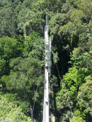 Son 5 torres de aluminio, construidas como andamios, que se elevan a más de 60 metros del nivel de la selva, por encima de las copas de los árboles, comunicadas entre ellas por pasarelas. La primera es de 24 tramos de 8 escalones que se suben rápidamente. La vista desde allí es difícil de describir por su belleza e inmensidad. Como dijo una señora americana que volvía, «breathtaking», nos deja sin aliento. Vamos pasando de torre en torre y seguimos maravillados por la vista que se extiende por kilómetros. No sólo vemos Brunei sino también Malasia que comparte la isla de Borneo con este país e Indonesia: Sarawak al oeste y Sabah al este.