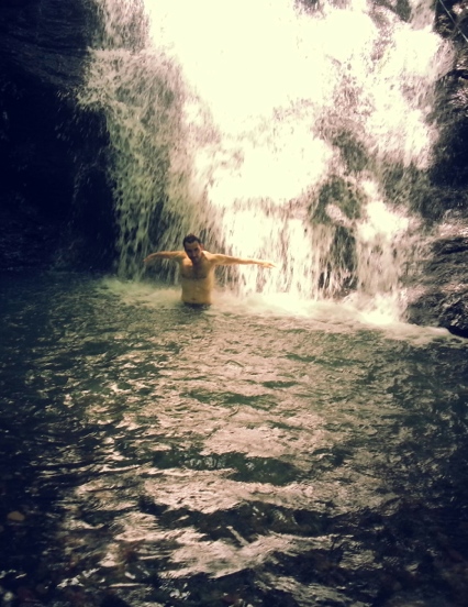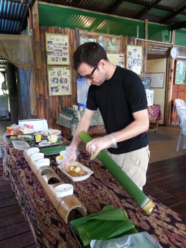 Regresamos a la embarcación y luego de unos minutos de navegación atracamos, bajamos del bote y caminamos por un lecho de piedras y ligera corriente. Al cabo de 10 minutos de andar, nos enfrentamos con una catarata, no muy grande, escondida en la selva. Una delicia, agua fría que baja de la montaña. Luego de chapotear unos minutos, volvemos a la costa y la embarcación y regresamos al campamento. El almuerzo está pronto. Parten el bambú y aparece el preparado en su jugo. A mí me gustó mucho, para Juan le faltó «gusto».