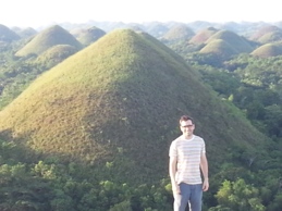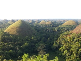 Visitamos una región llamada Chocolate Hills, que de chocolate, rien de rien!. Accidentes geográficos particulares que parecen ¨erupciones cutáneas¨. Son montañas que emergieron por causa de movimientos tectónicos de hace dos millones de años y que en su momento estaban cubiertas por corales. Hoy con el efecto del sol al amanecer, se ven las 1640 montañas que parecen de color chocolate rojizo y que agradan la vista de muchos, especialmente de mi tío!.