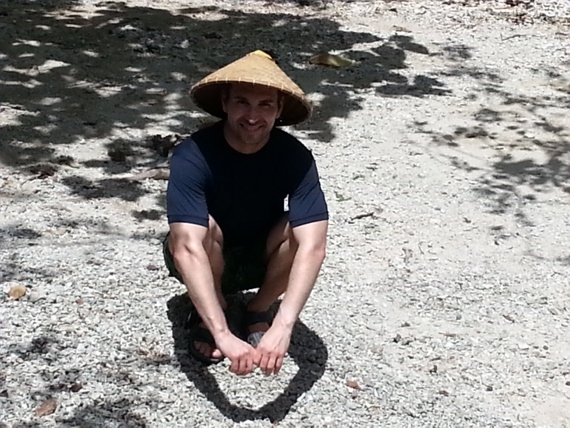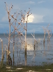 Una de las experiencias nuevas fue un paseo en bote (Juancho en uno y yo en otro) por unos manglares en una isla en la que hay pinturas rupestres (de dudoso valor) que comparan con las de Altamira en España. LLegamos al lugar donde se cruza a la isla en una moto alquilada manejada por Juan Martín por un camino lleno de pozos. Yo iba prendido como loro en mudanza.