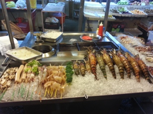 Casi todos los platos van acompañados de arroz blanco. Hay abundancia de mariscos y pescados. A las 7 y media se encienden los fuegos en los braseros de la playa y te preparan langosta, cangrejo, pescados, calamares a la parrilla y se eligen el acompañamiento de salsa que uno quiera de entre 6 o 7 opciones. Difícil de describir, todas deliciosas, probamos langosta, langostinos gigantes y calamares con las salsas que nos aconsejaron.